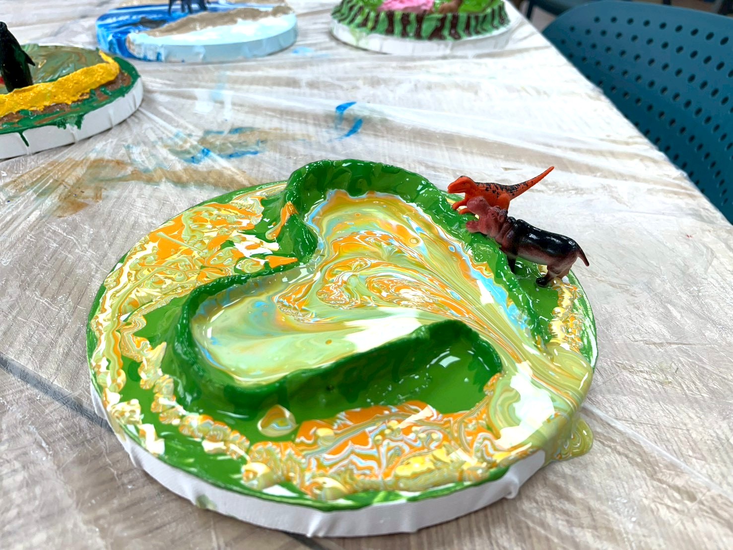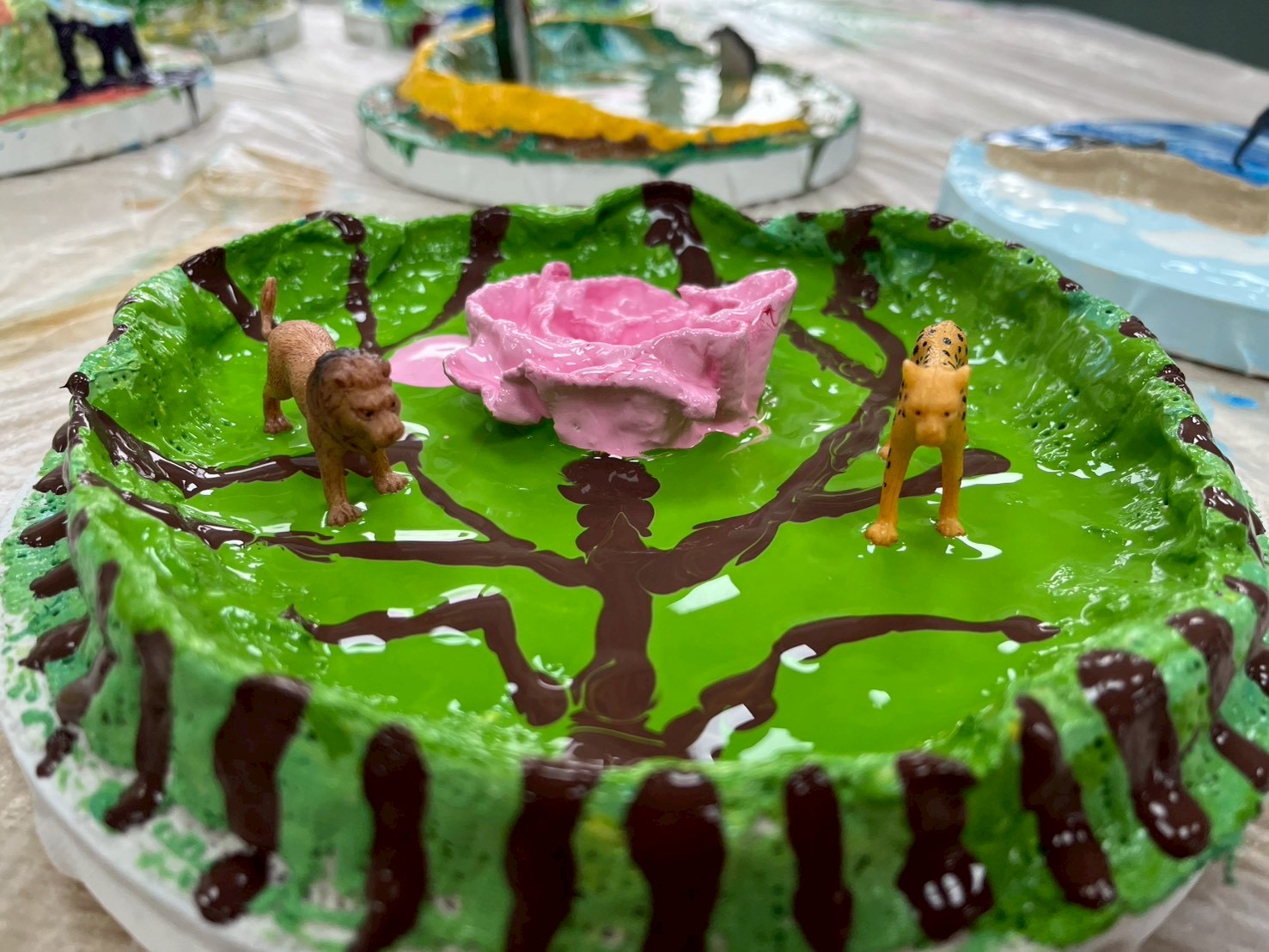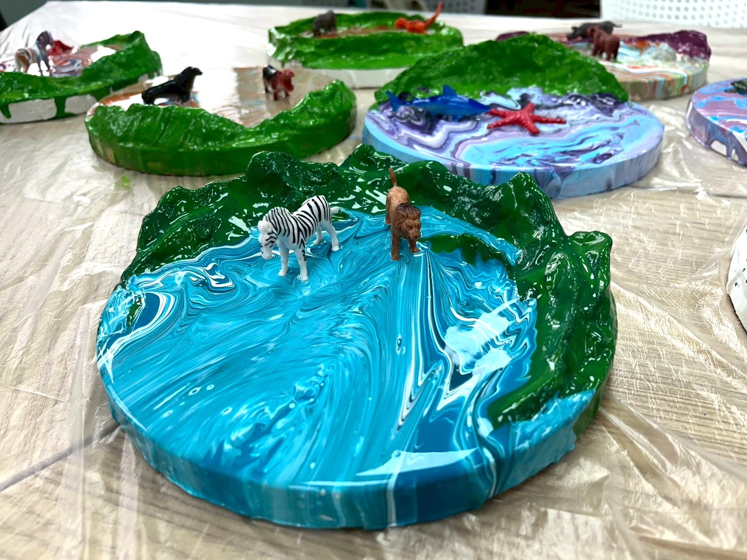 透過石膏塑形,他們勾勒出心湖的形狀,再以流動畫調配出湖泊獨特的色彩與情緒。